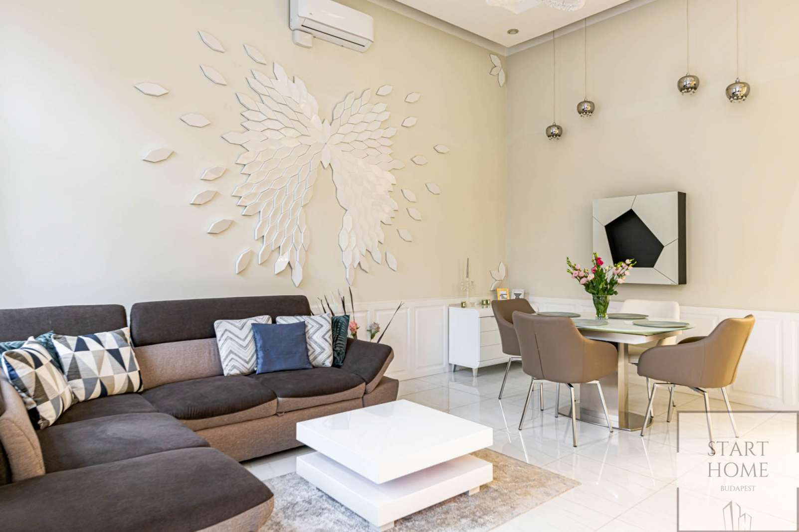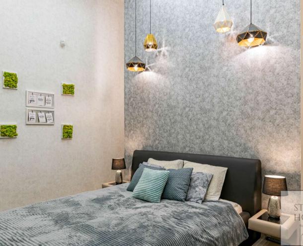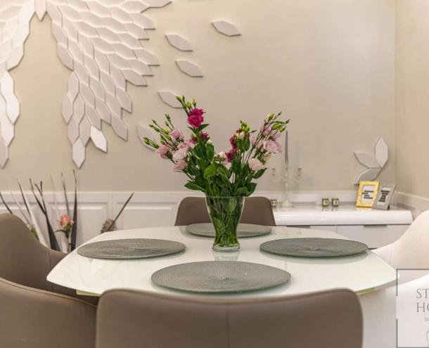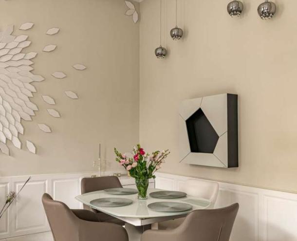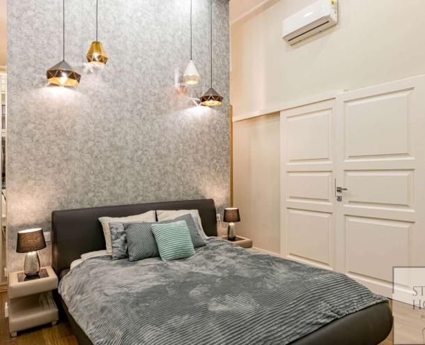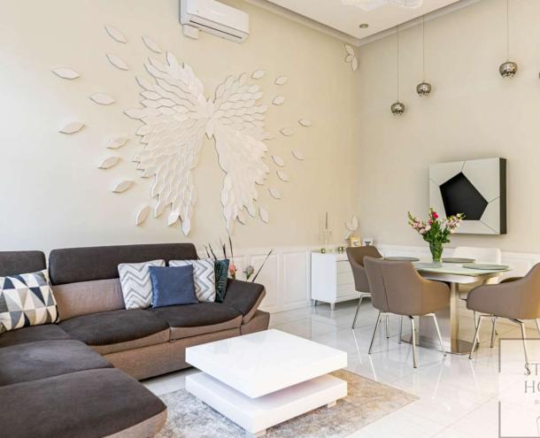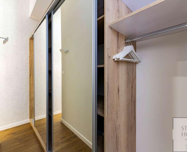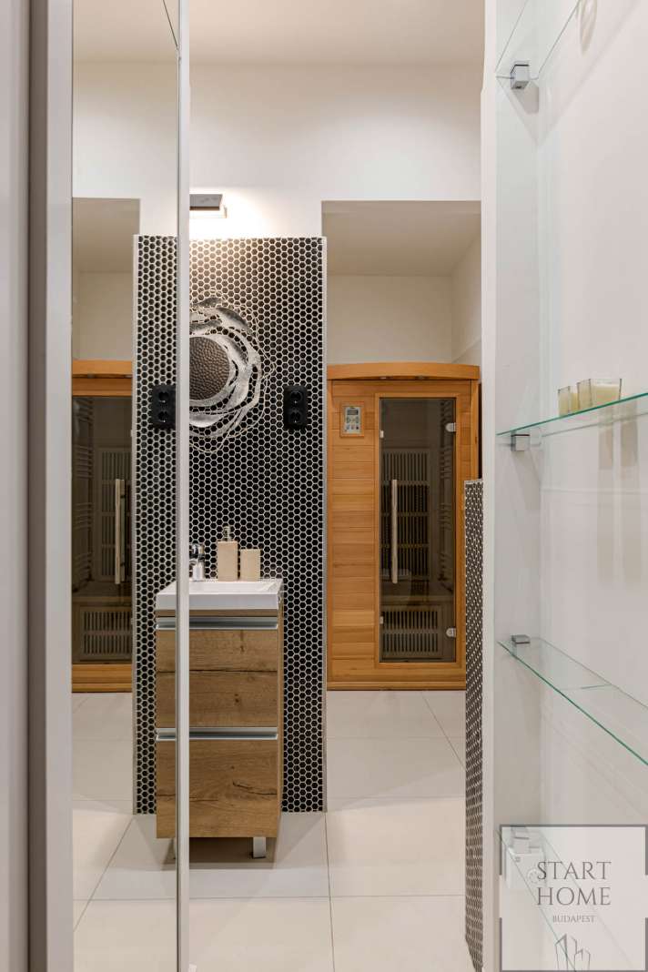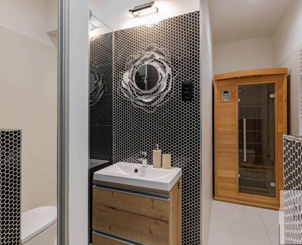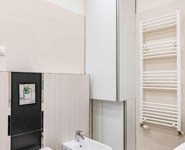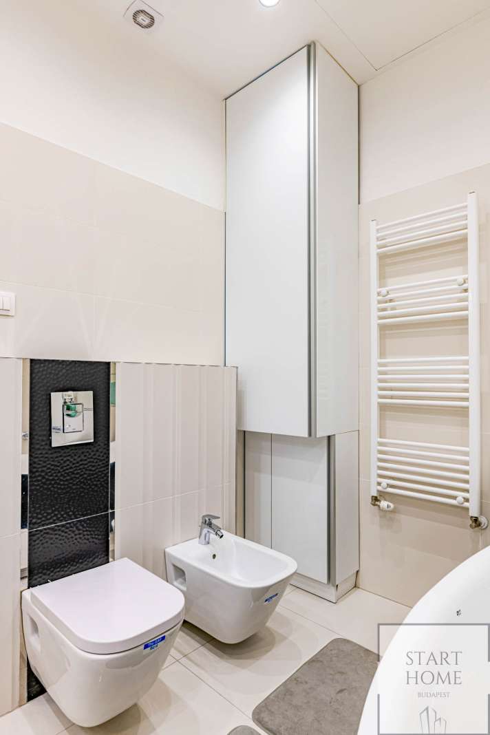 The 1st floor property has been renovated with unique design solutions, the kitchen is fully equipped, both bedrooms have their own bathroom (one with bath and the other with shower).