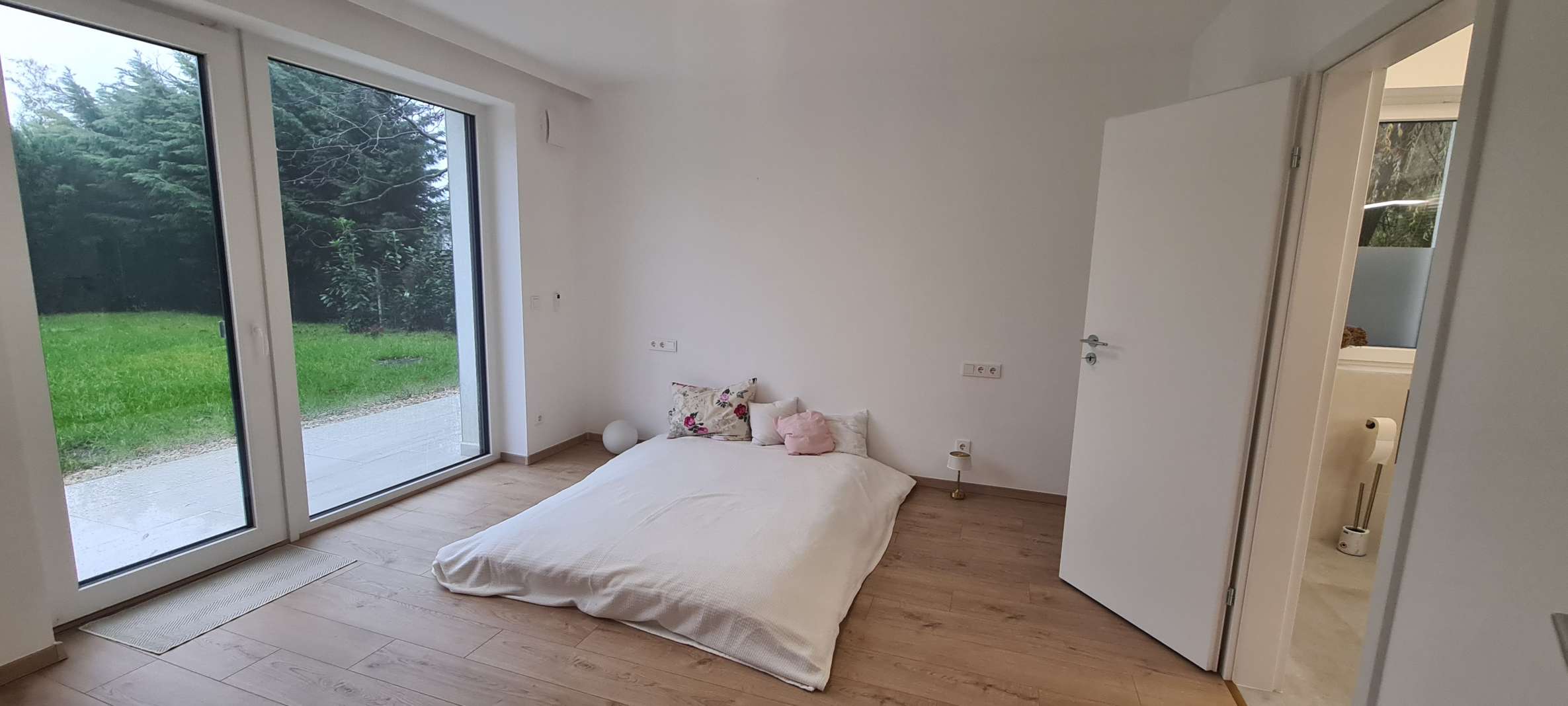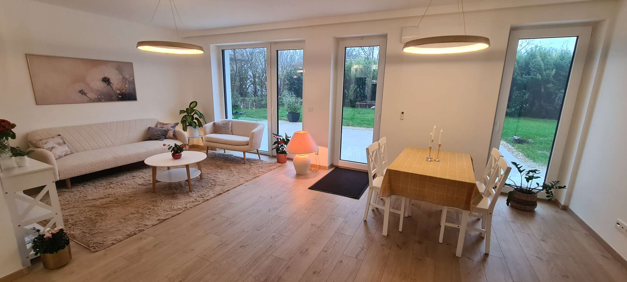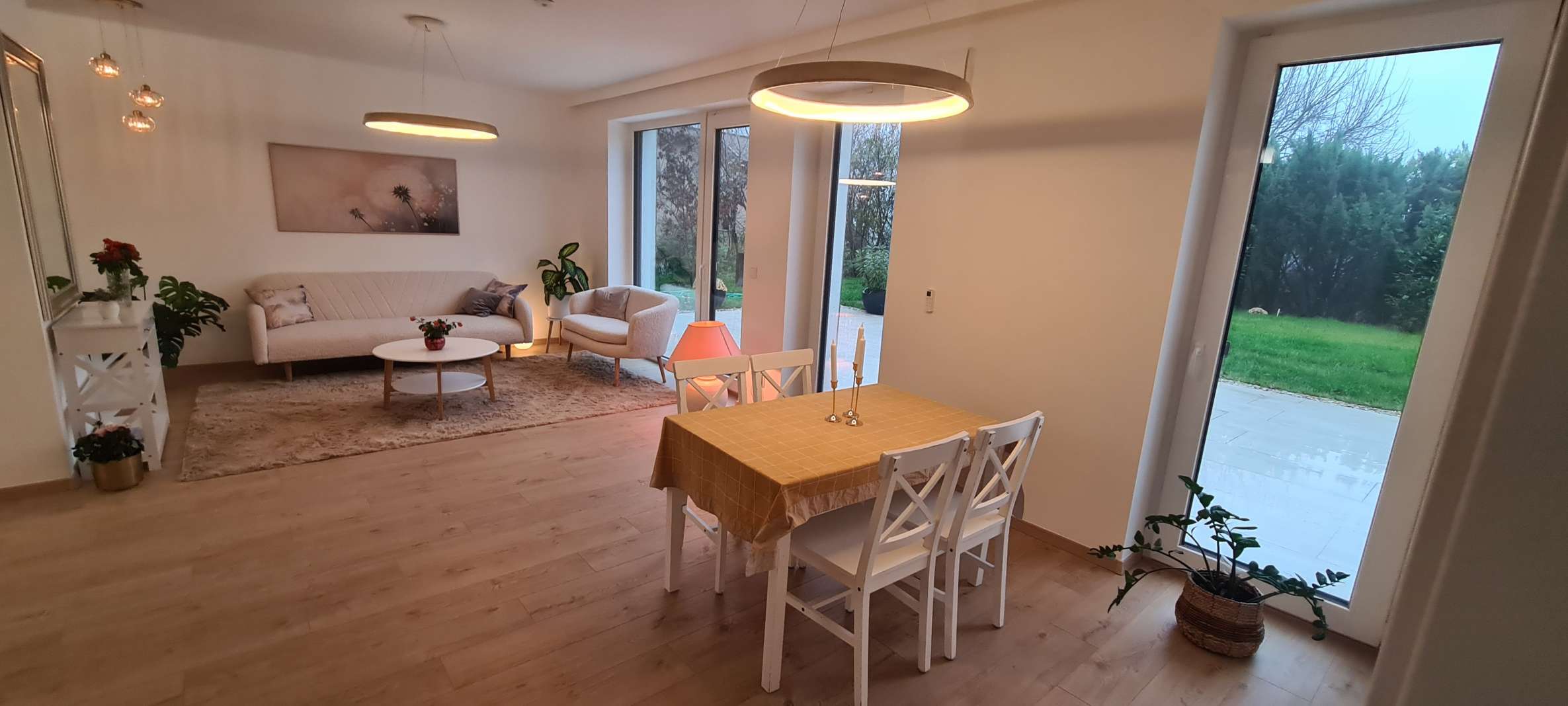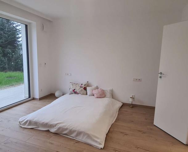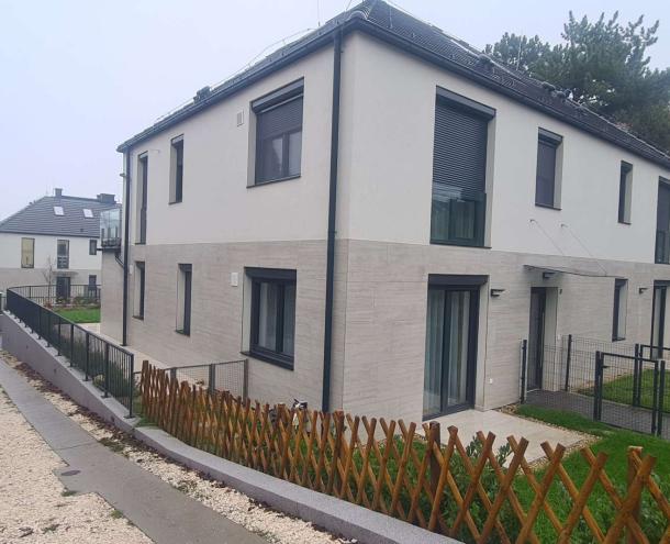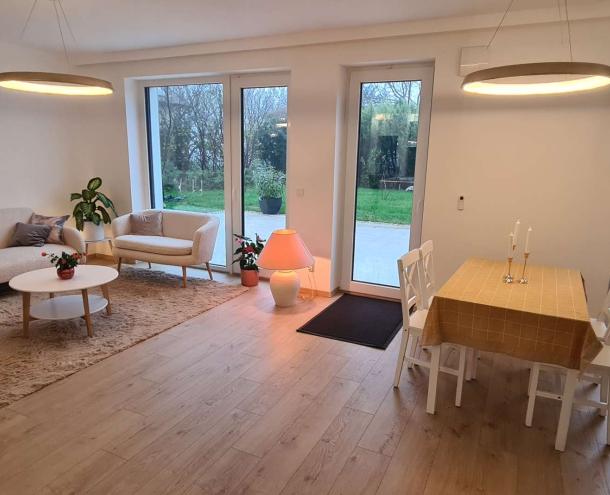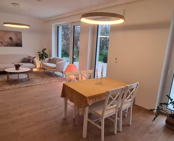 A 105 m² apartment with garden access is available for rent in a 4-apartment condominium built in 2025. The apartment has an open-plan kitchen and living room, 3 bedrooms and two bathrooms. The living room opens directly onto a 60 sqm terrace and from there to a 500 sqm garden for exclusive use. Partially furnished with the furniture shown in the pictures. Heating and cooling are provided by a heat pump ceiling and floor heating and cooling system, which can be operated remotely using the Loxon smart home system. All windows are equipped with electric shutters. The kitchen is equipped with high-quality appliances. (Refrigerator, dishwasher, larger-than-average induction hob, steam oven and combi microwave oven, extractor fan, washing machine, dryer) A parking space equipped with an electric charger for two cars and a 3 sqm storage room can be rented for an additional 76,000 HUF/month.. Common cost is : 35.000,- HUF/month, The apartment is ready to move into immediately.