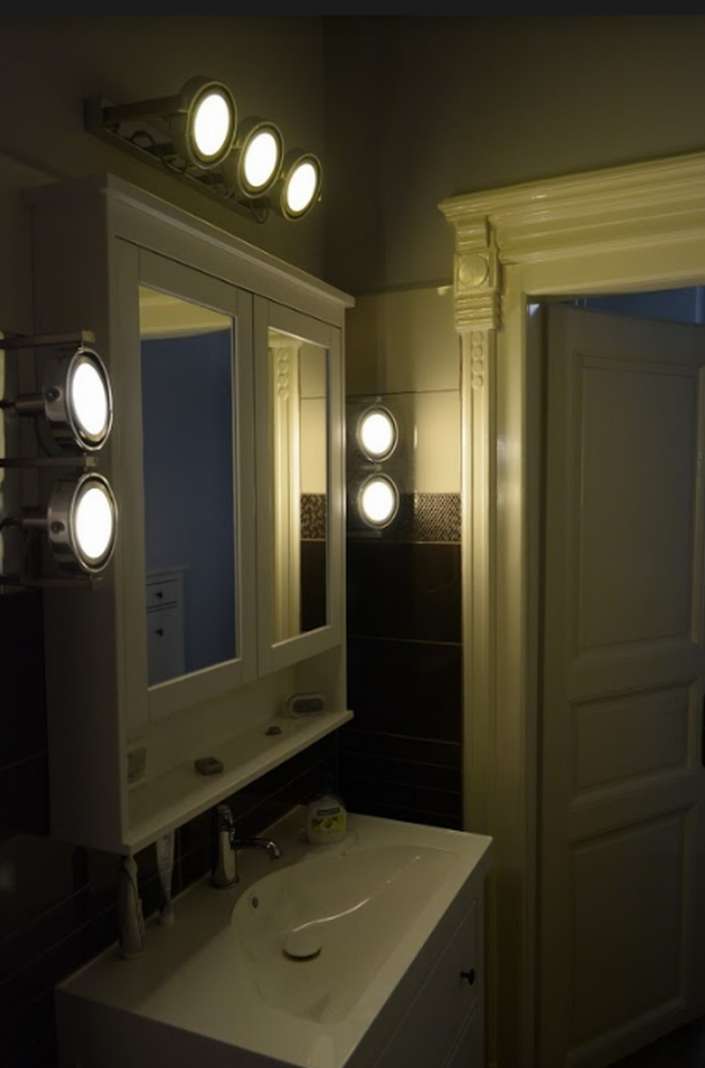 The bathroom comes with a glass wall shower, built in light in the tiles and a stand alone bath tub, all well ventilated.