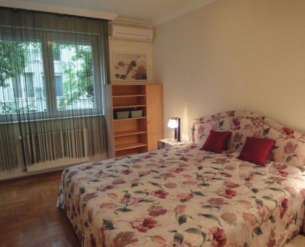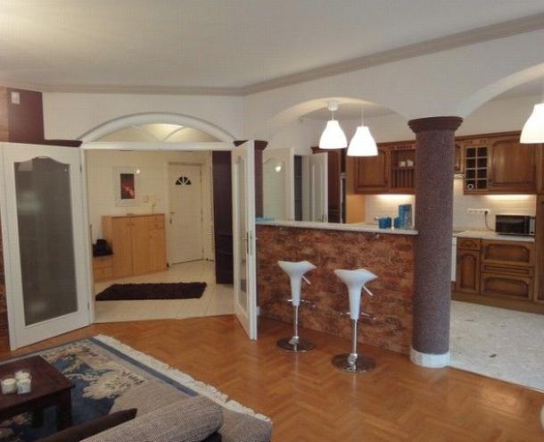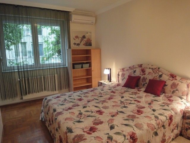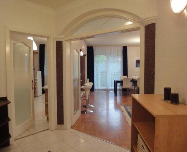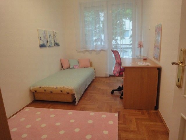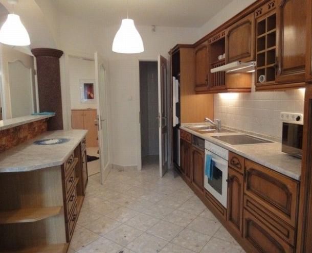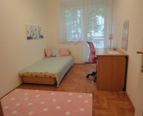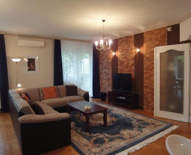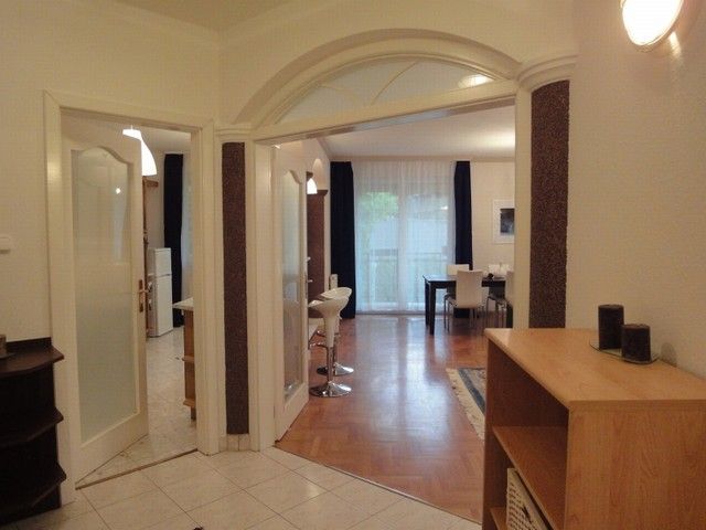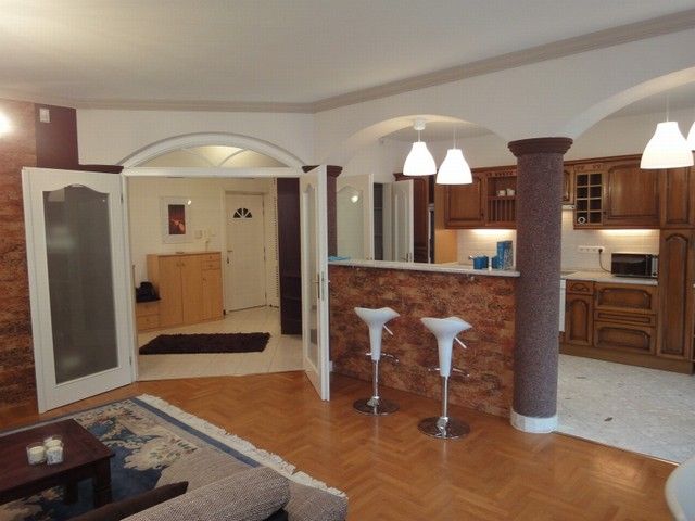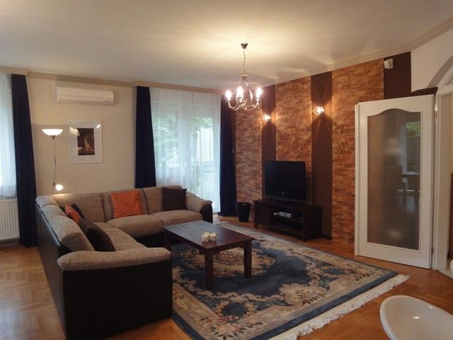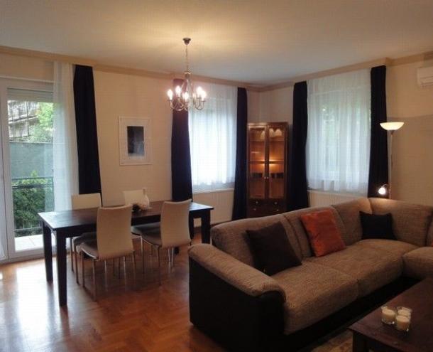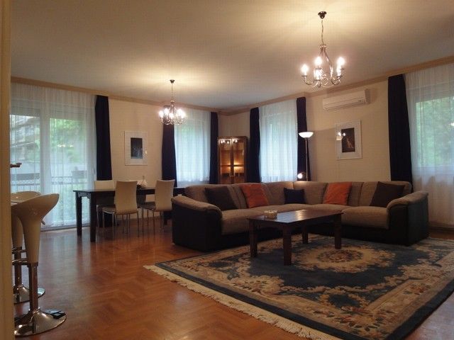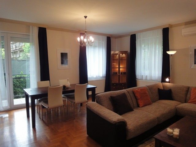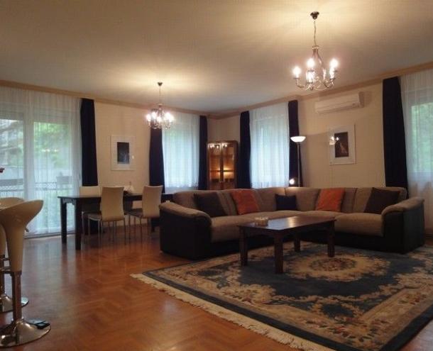 SPACIOUS APARTMENT, nice garden, excellent public transport!! 116 sqm flat for rent on 1st floor (elevator) in a 14-flat house, built in 2003, at the beginning of Hűvösvölgyi út. The apartment consists of a large living room with open-plan kitchen and a balcony, 3 separated bedrooms with common balcony, 1 bathroom (bathtub, doubla wash basin, toilet, bidet), 1 shower with toilet and a laundry room. There are alarm system and air-conditioner in this furnished flat. The common cost is 51.300 HUF/month. Garage for 1 car and a storage room in the cellar belong to it. Small pets are welcome! Available from 15th of April 2026.
