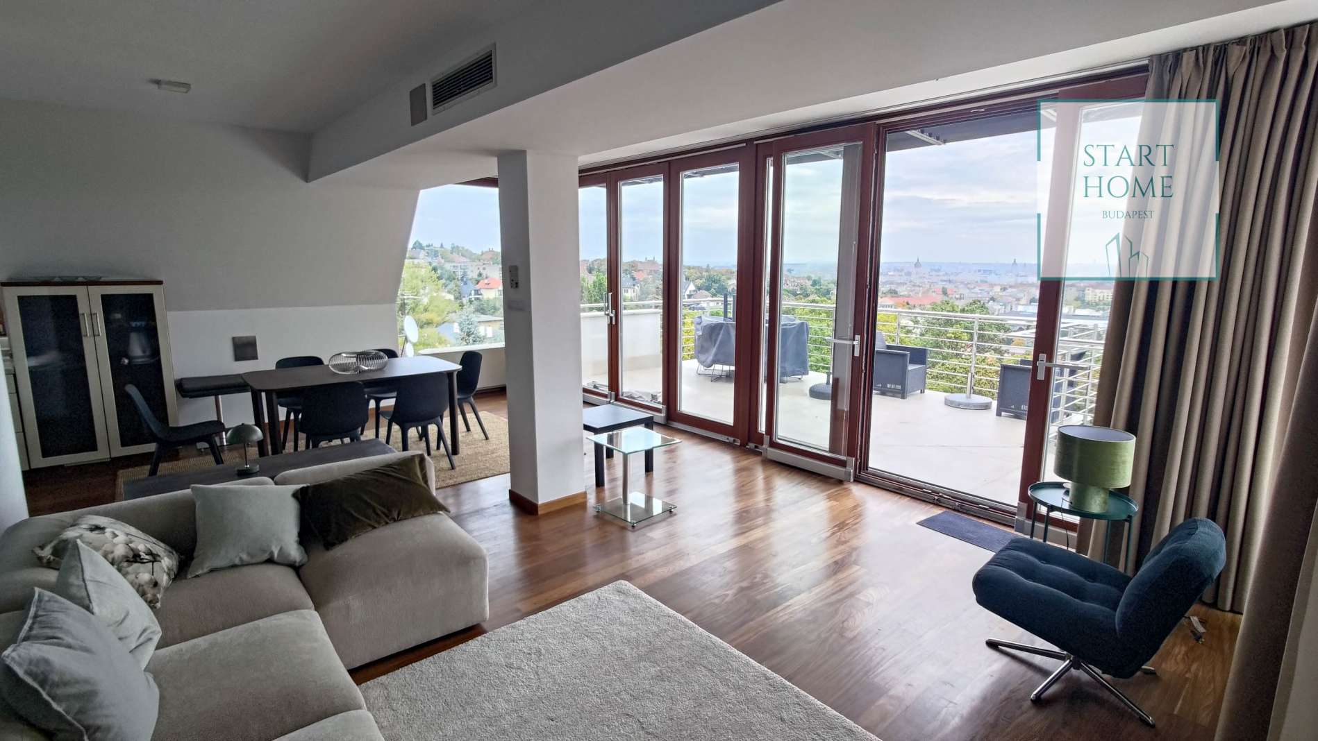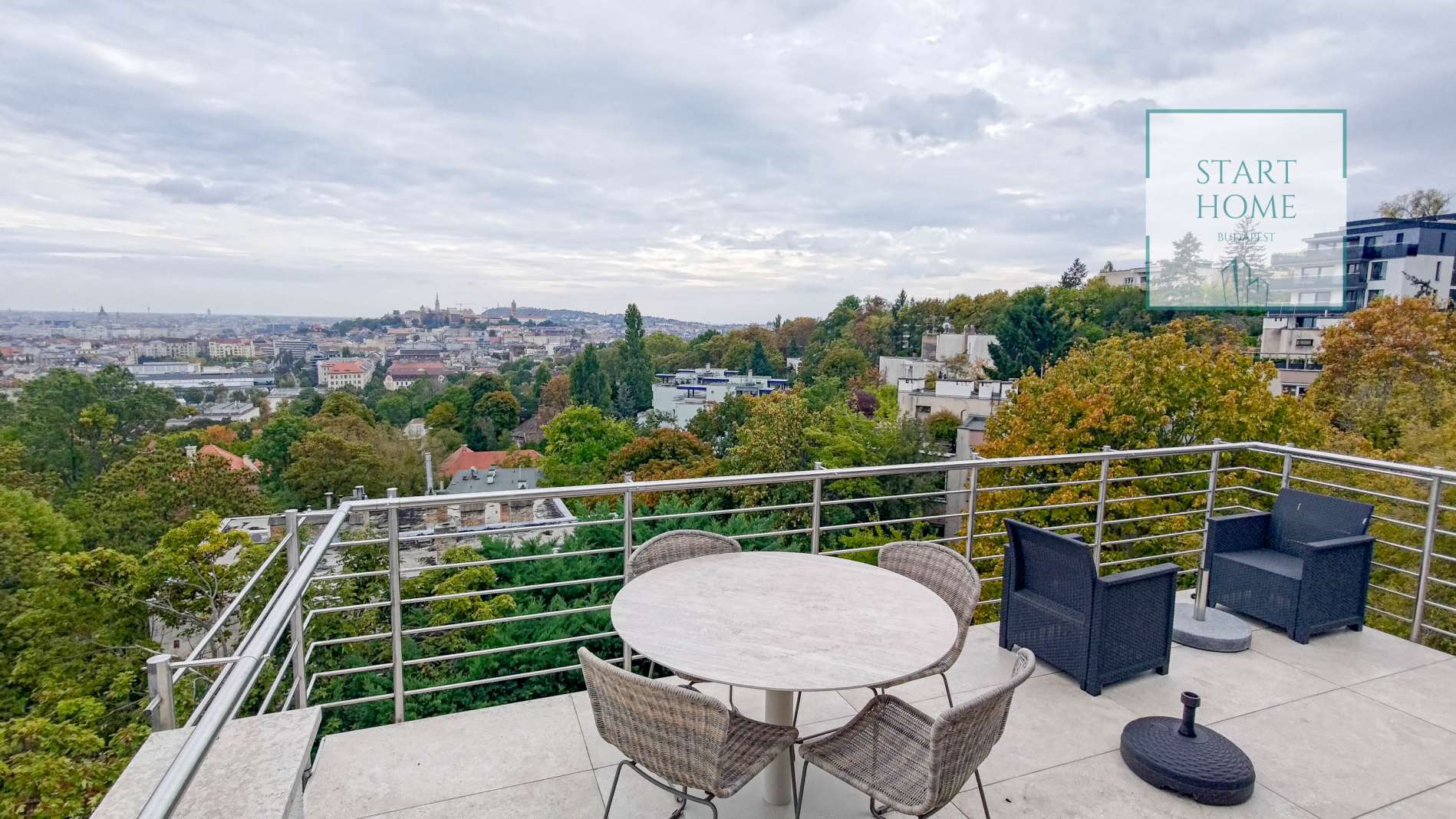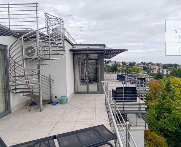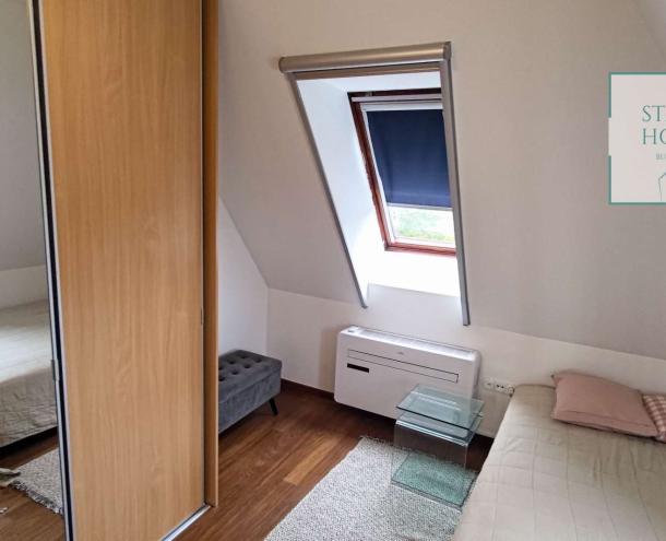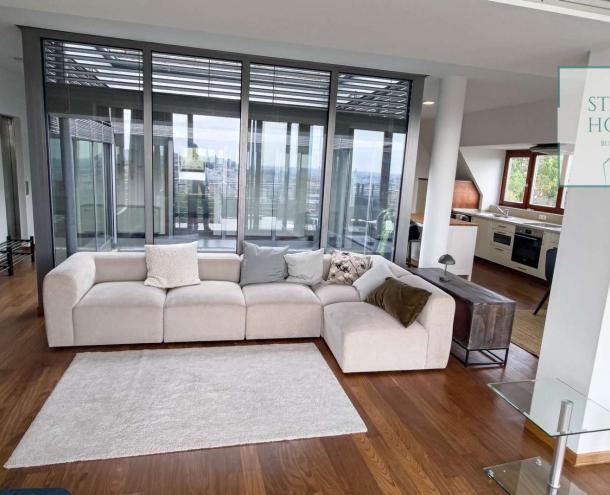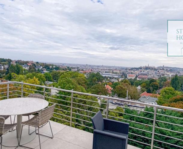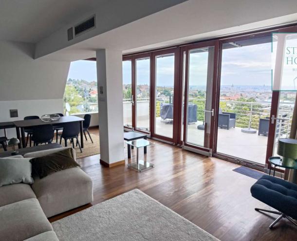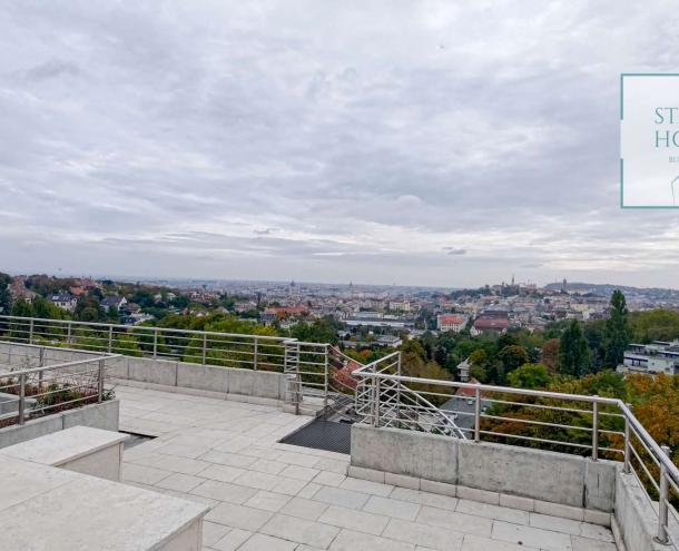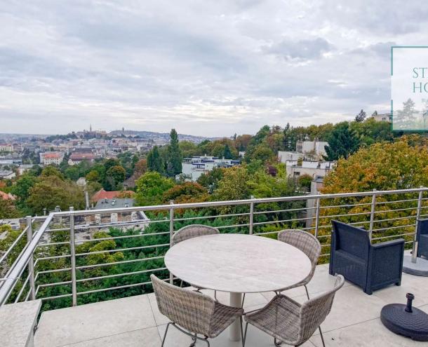 PENTHOUSE WITH PRIVATE ROOF TERRACE!! 140 sqm penthouse flat for rent on 3rd floor (lift) in a 7-flat house, built in 2003. The apartment consists of a living room, 3 bedrooms, open-plan kitchen, 2 bathrooms, 30 sqm terrace + 90 sqm roof terrace, beautiful view to the city (Mathias Church, Castle, Danube). A/C, fan coil, alarm system. The flat is furnished right now, but it can be rented without furniture. Storage room and garage for 2 cars belong to it. Common cost 112 000 HUF/month incl utility flat rate (excluding electricity). The rental fee contains the utility charges! NO PETS!