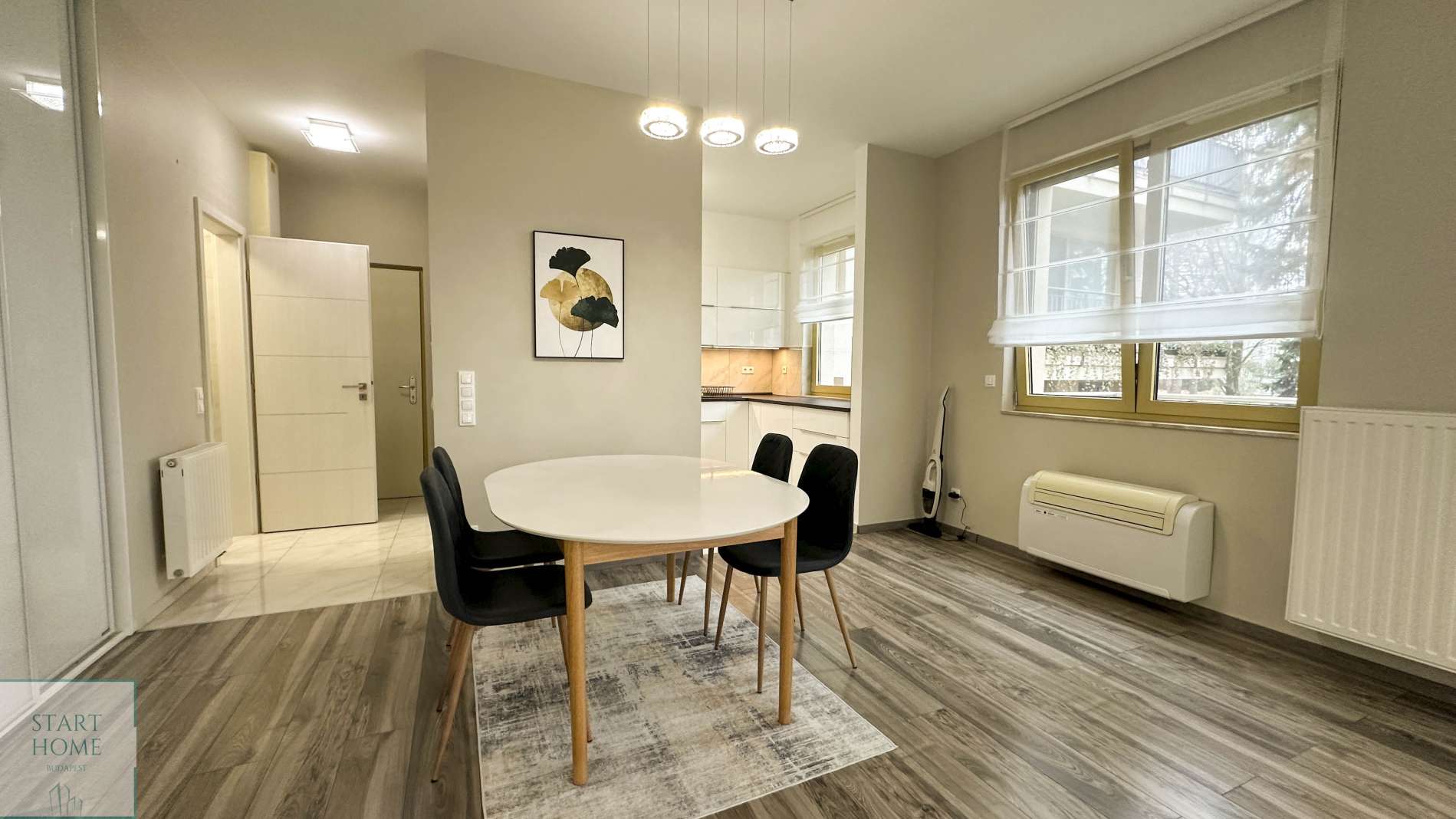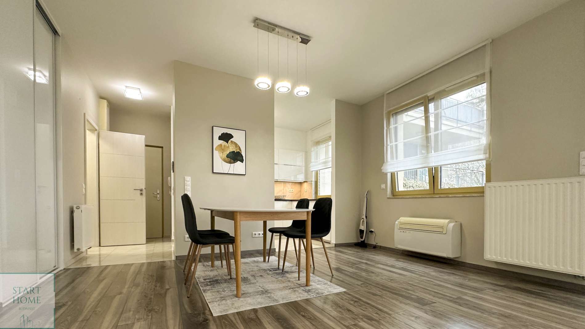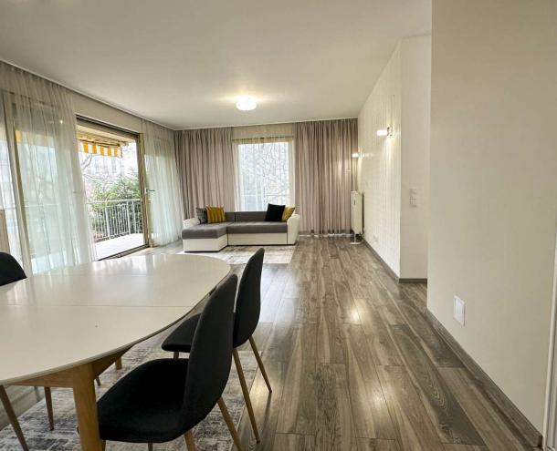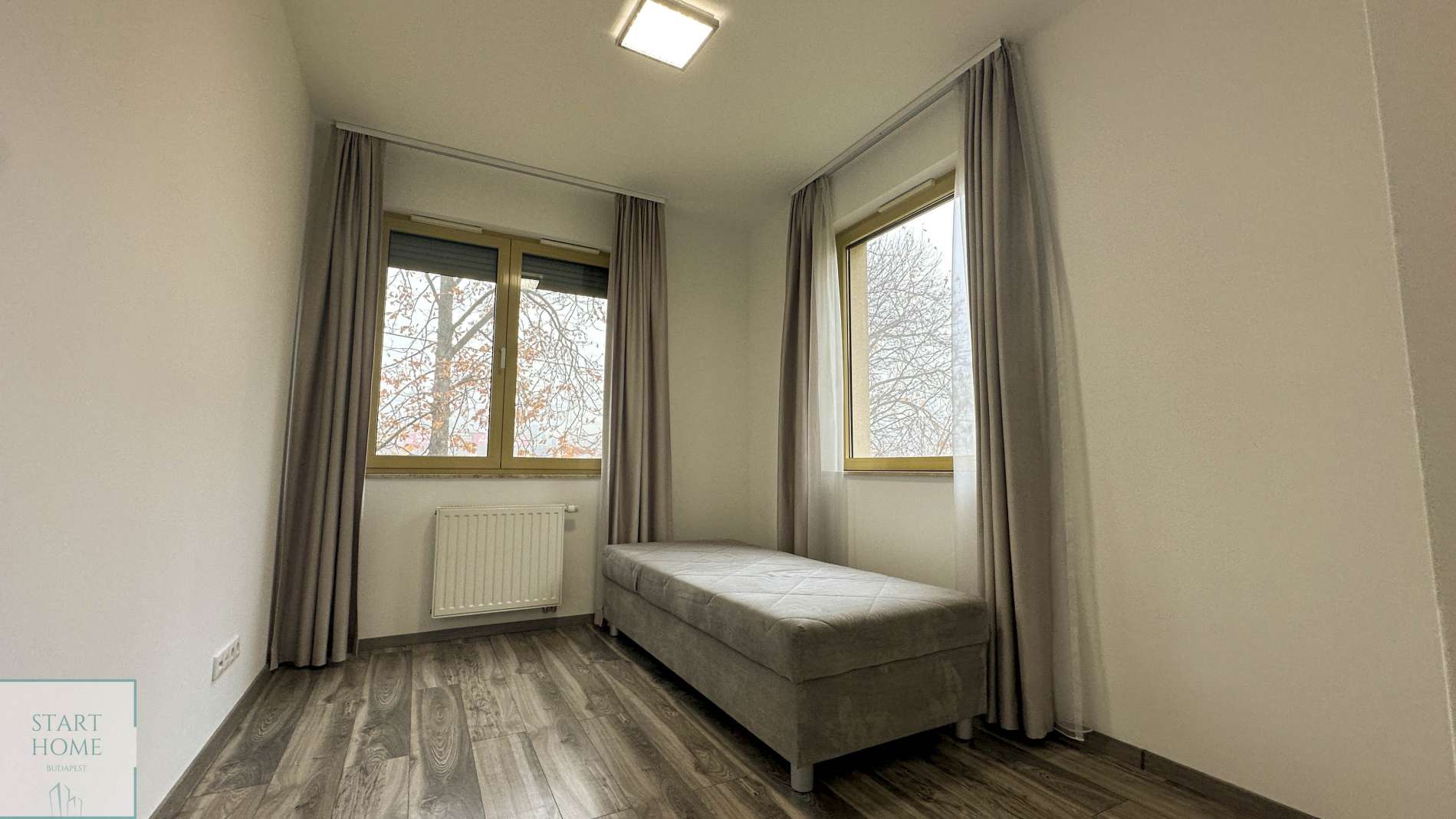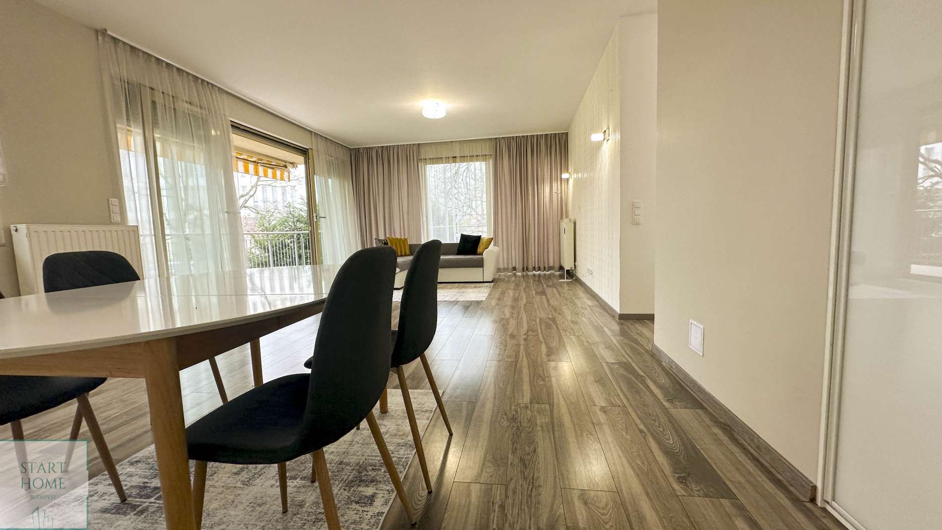 A 120 m2 first floor apartment with garage and storage space is available for rent in the Szemlőhegy Liget residential park in Budapest's 2nd district. Equipped kitchen, large open-plan dining room and living room, 3 bedrooms, 2 bathrooms, separate toilet. Large glass surfaces, modern appearance, partially furnished. The residential park, which is also popular with foreigners, provides security services and maintenance of common areas. There is a playground for children within the fence, shopping centers, sports fields, and green areas nearby. The property is also easily accessible by public transport. Cooling provided by air conditioning in the living room. Electrical shutters and mosquito nets on all windows. Renovated, ready to move in at any time.