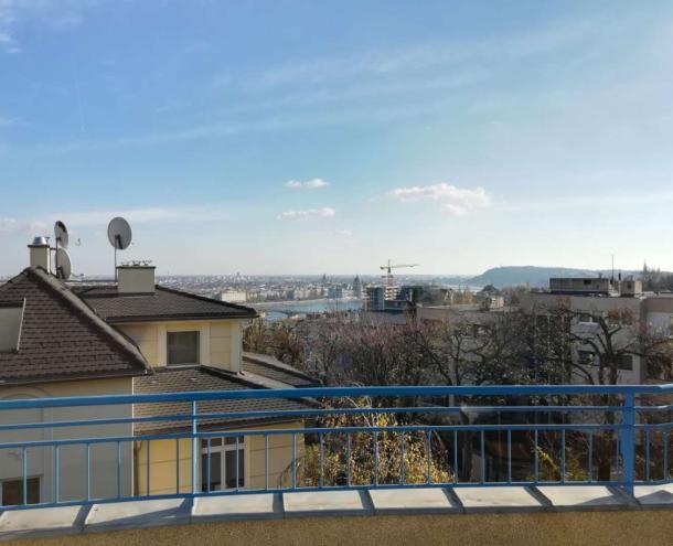 FANTASTIC PANORAMA OF THE DANUBE, THE PARLIAMENT. A two-storey, 154 sqm, top, 2-storey apartment of a 6-apartment condominium built in 2001 is for rent. Downstairs there are 3 bedrooms, 1 bathroom with bathtub and a bathroom with shower, a separate toilet, a utility room and an 18 sqm balcony. On the upper level is the large living room with a 64 sqm terrace with a fantastic view of the Danube, an American-style kitchen with a dining area and a toilet. Parquet and stone coverings, air conditioning, alarm, own central heating, garage for one car, common garden. Pets are allowed by prior arrangement. The common cost is 120 EURO / month. Floor-plan!