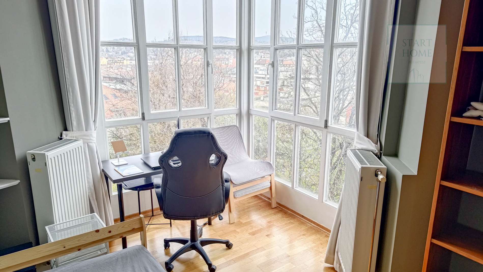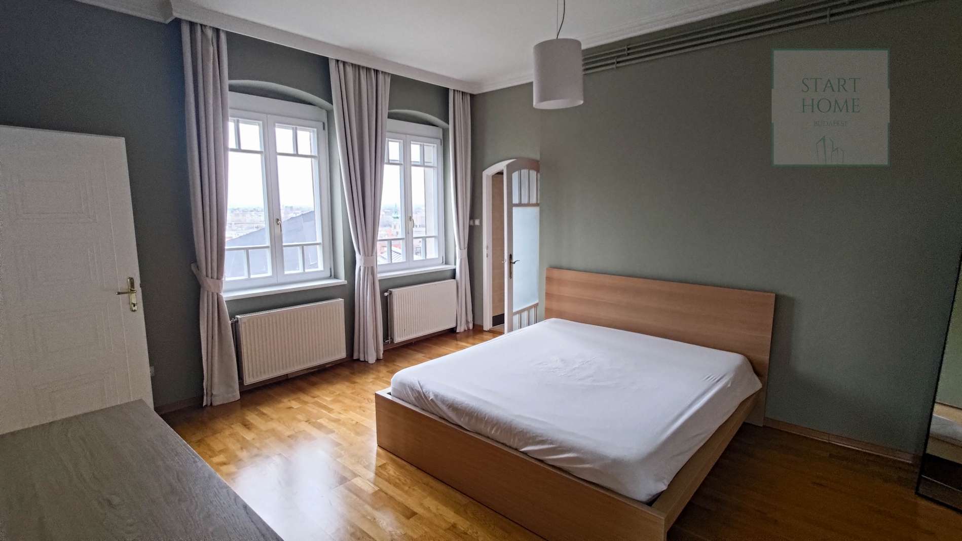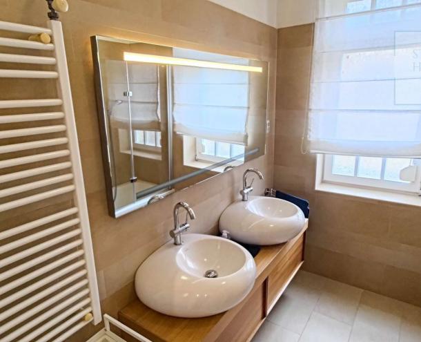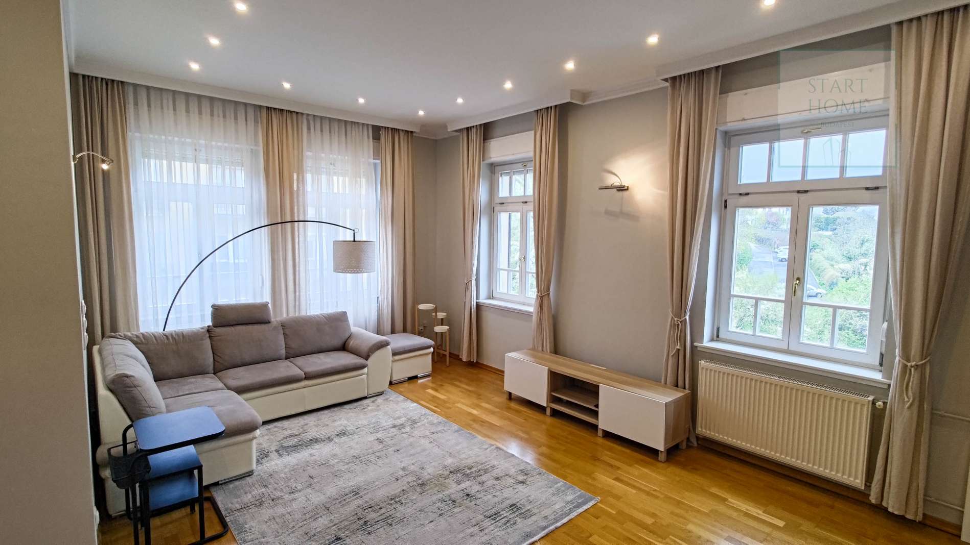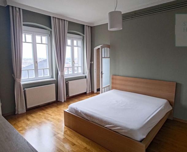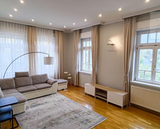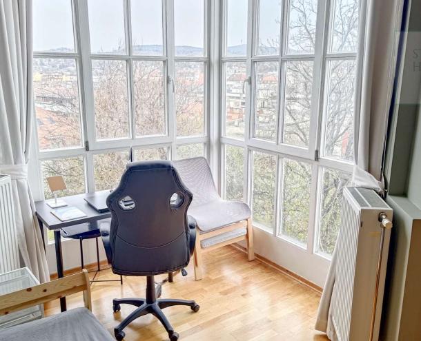 This 100 square meter first floor apartment, furnished with modern furniture, is located in a beautiful villa for rent near the Buda Castle District. The living room and the dining room are in the same space, but the kitchen is closed. From the living room we enter the master bedroom and the second bedroom. The master bedroom leads to the study room, which, thanks to the huge windows, offers a panoramic view of the city. Our own circular heating provides the heat and the air conditioning cools in the summer. The apartment has a 4 sqm balcony, which can be accessed from the front door. Parking is possible on the street (free with an address card) or a separate garage can be rented 50 m from the apartment. Common cost is : 50.000,- HUF/month.
