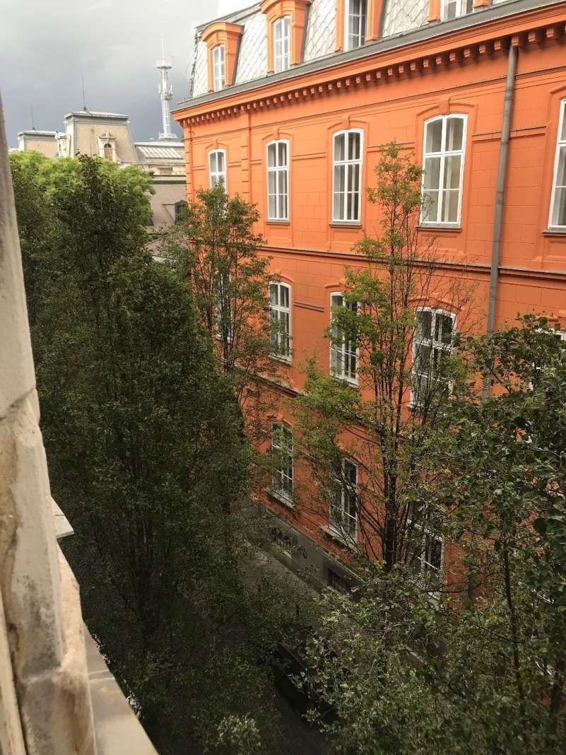 A szobák ablakai a csendes, fákkal szegélyezett Ötpacsirta utcára néznek, amelyet Budapest egyik legszebb utcájának választottak.