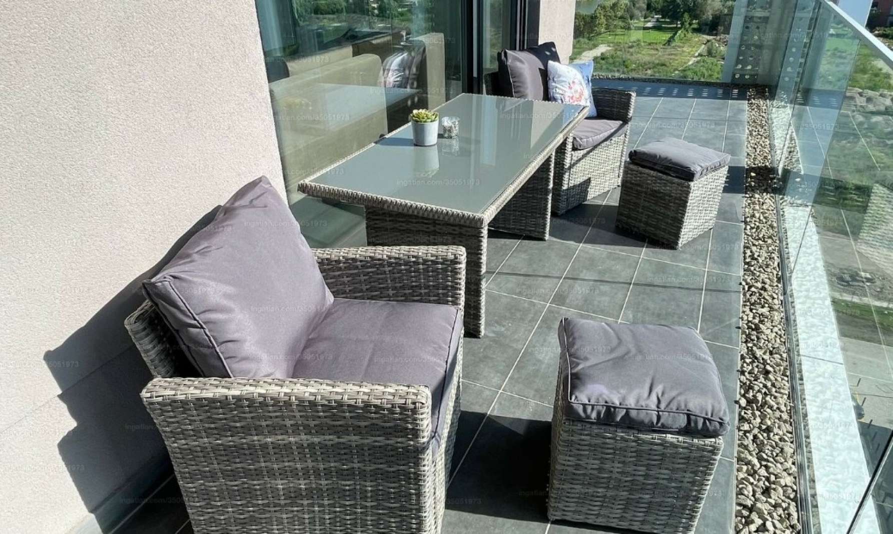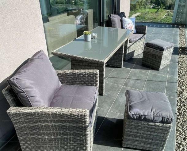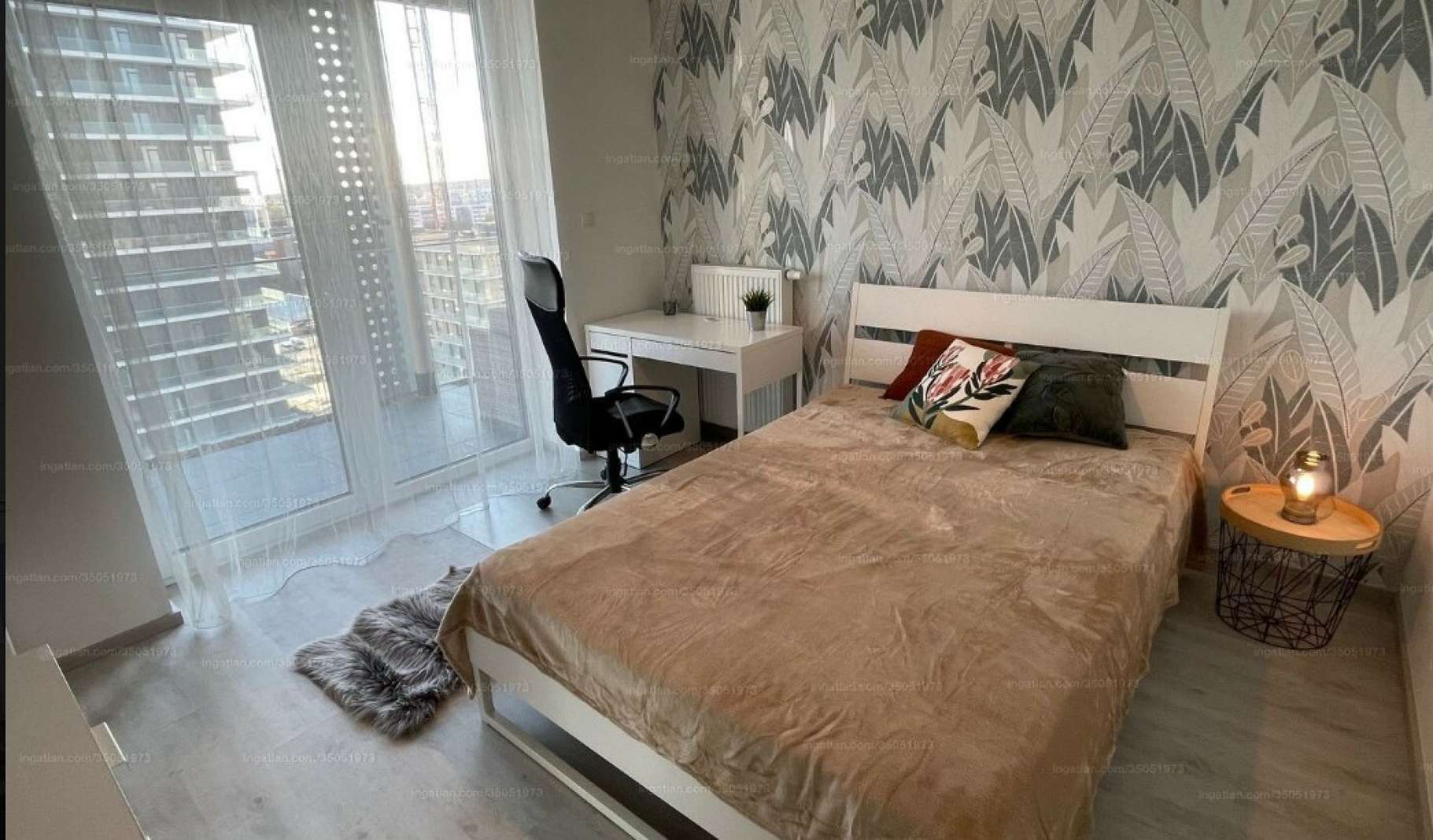 Nappali + 2 szobás, 73 m²-es, 2 fürdős (kádas és zuhanyzós) lakás 40 m²-es terasszal. Teljesen gépesített amerikai konyha, új bútorok, dupla klíma, elektromos redőny, mosógép.