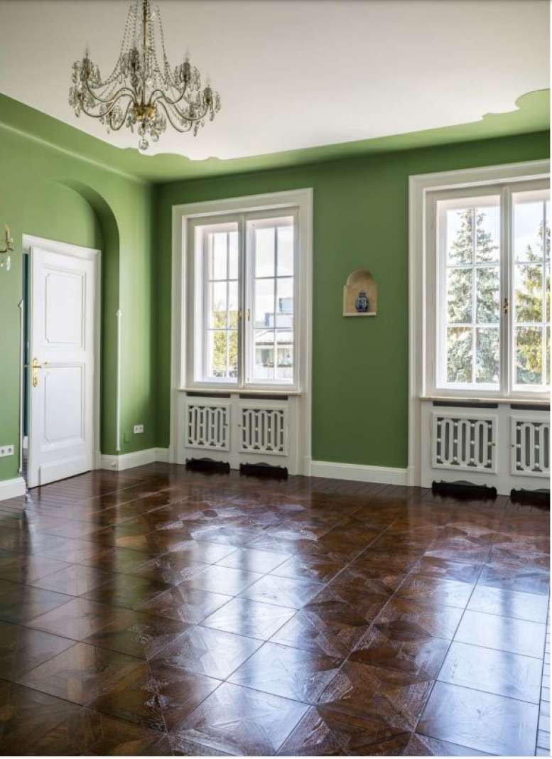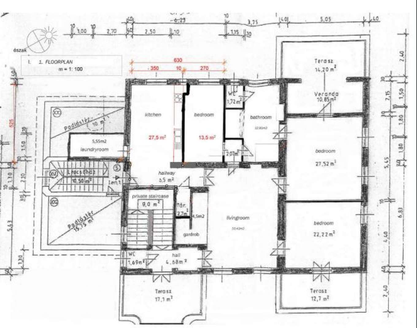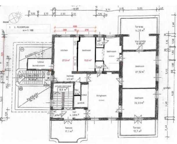 Az épület 5 lakást foglal magában. A lakás az épület első emeletét teljes mértékben elfoglalja és külön impozáns bejárati lépcsőháza van. Az épület különálló, más épülettel nem érintkezik egy 2000 m² parkosított kertben fekszik.
