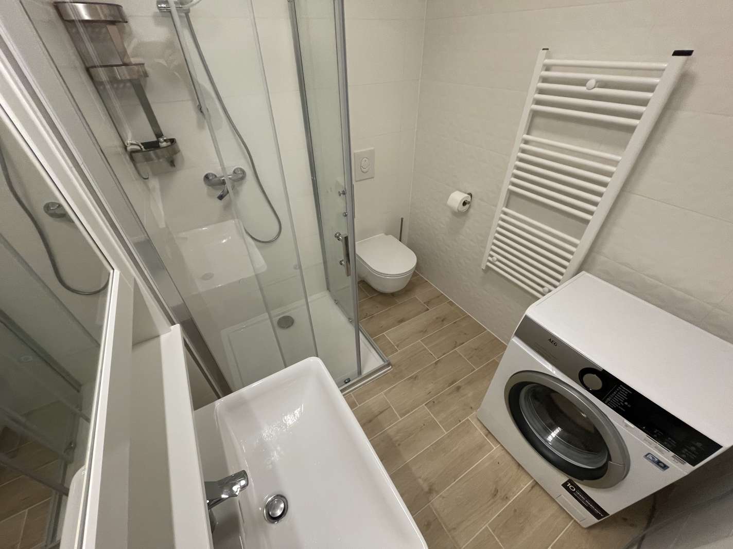 A lakás igényesen kivitelezett, egyedi konyhabútor beépített gépekkel, hűtőszekrény, mosógép várja