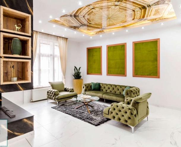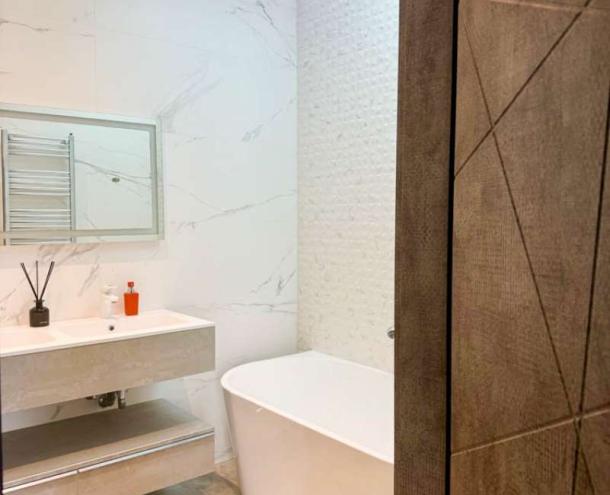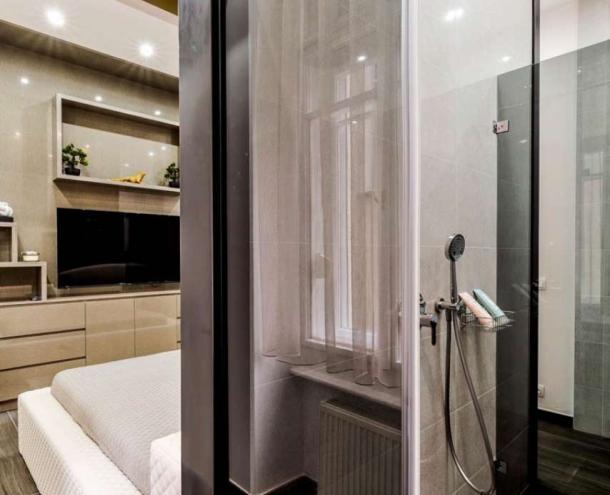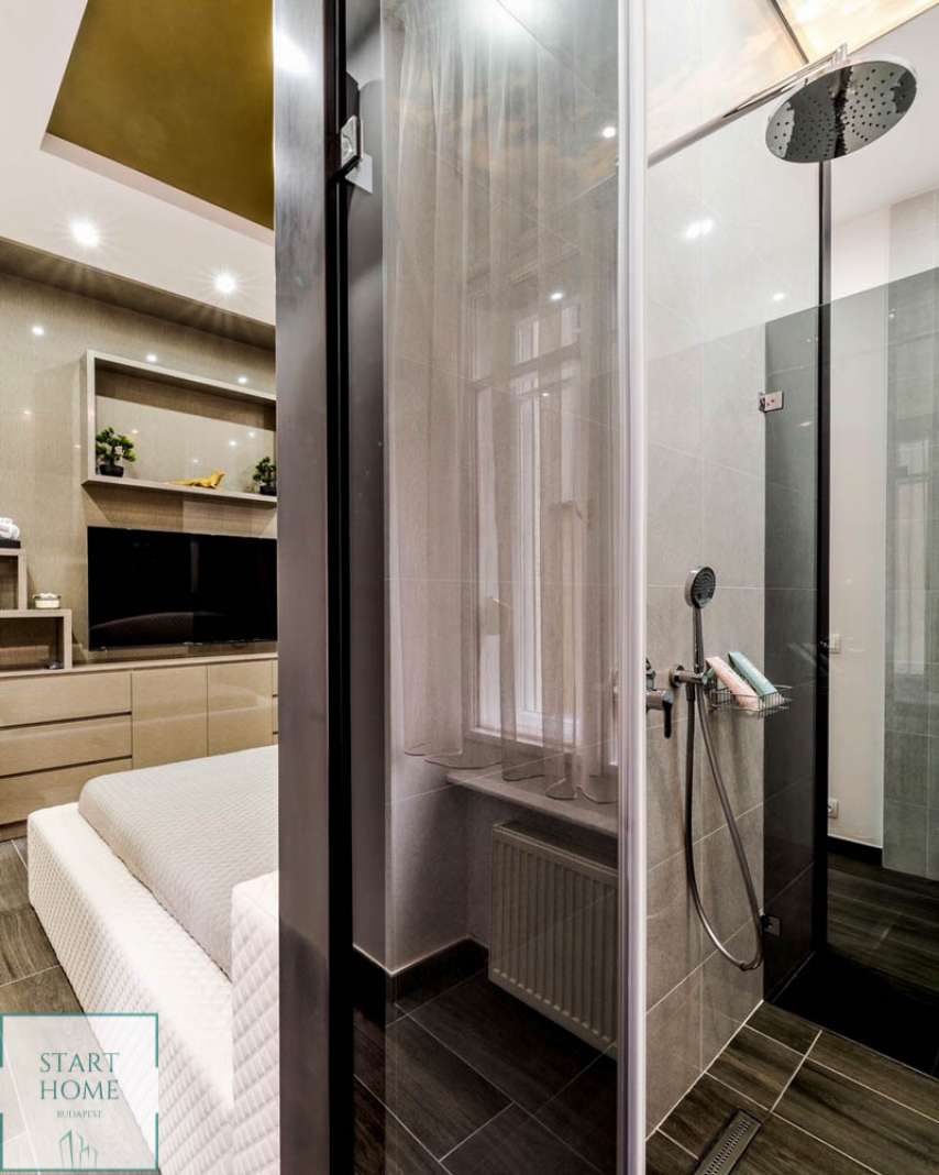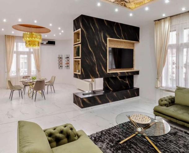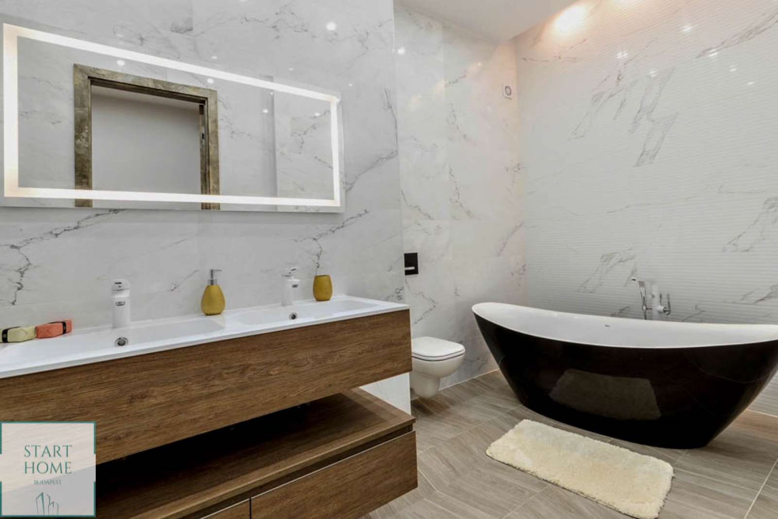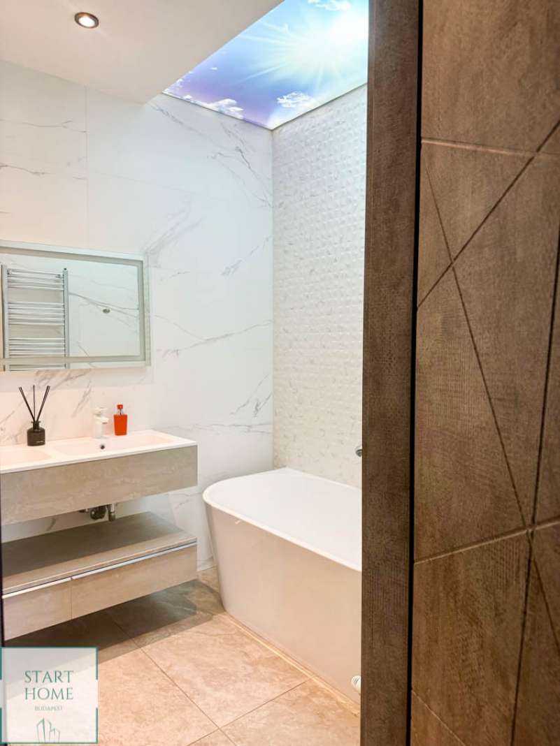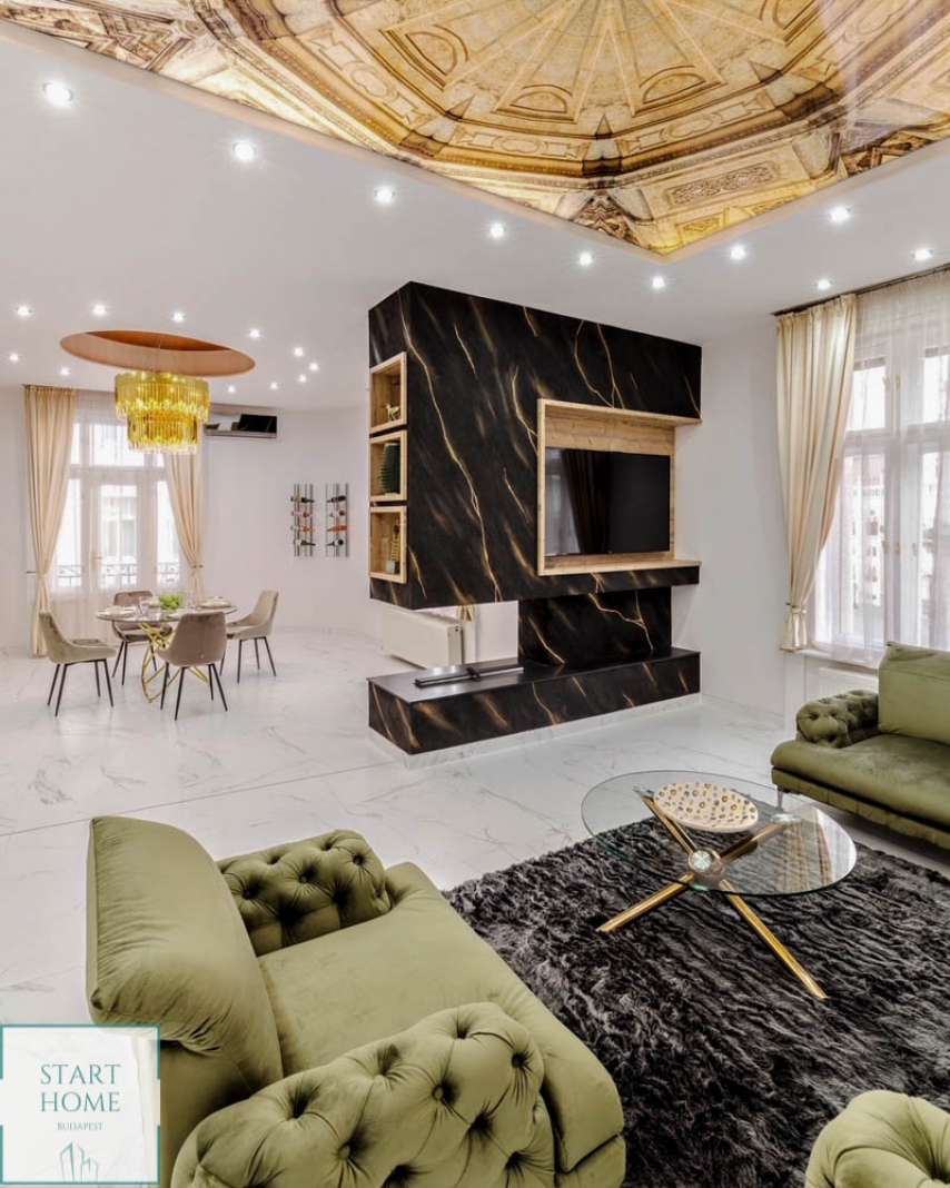 A lakás klimatizált, kandallóval felszerelt, magas minőségű burkolatokkal és egyedi megoldásokkal kialakított.