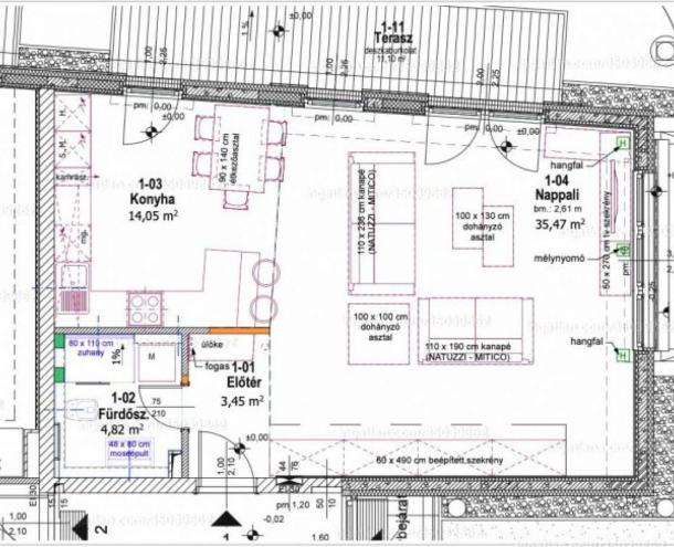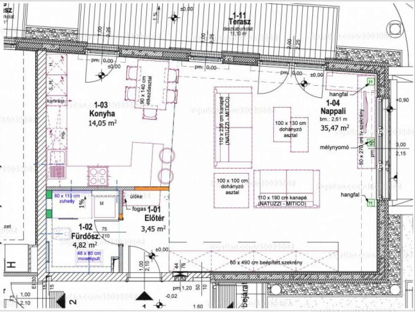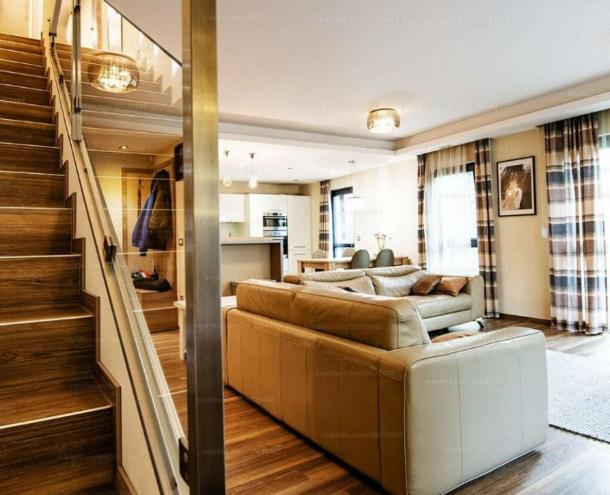 Az alsó szinten amerikai konyhás nappali, kertkapcsolat és fürdőszoba található.