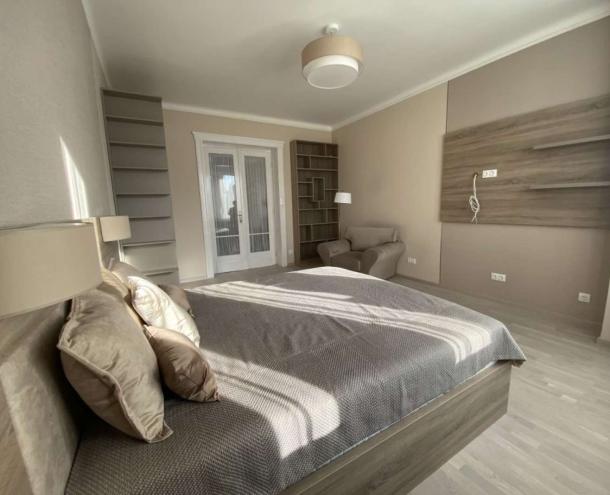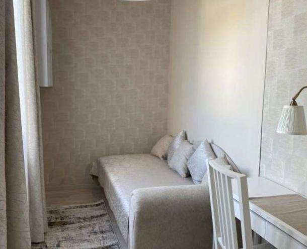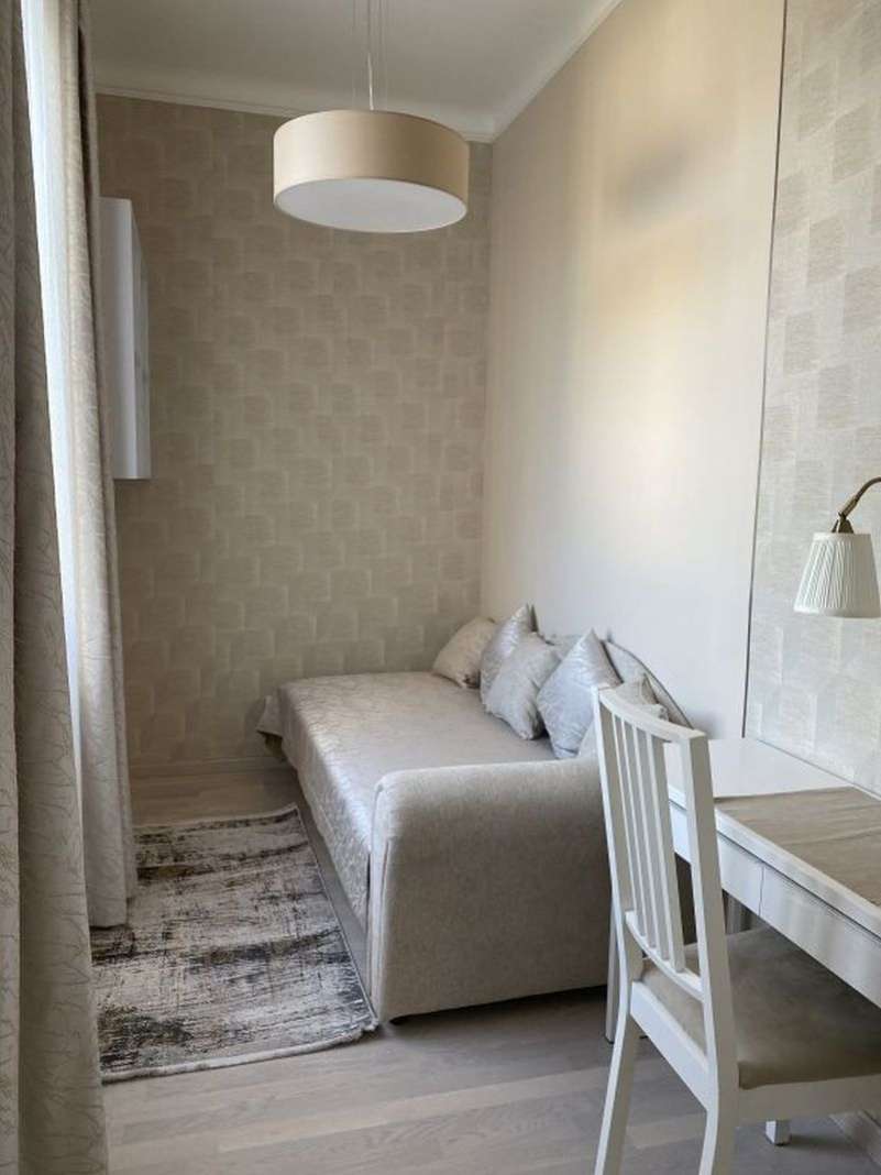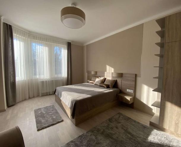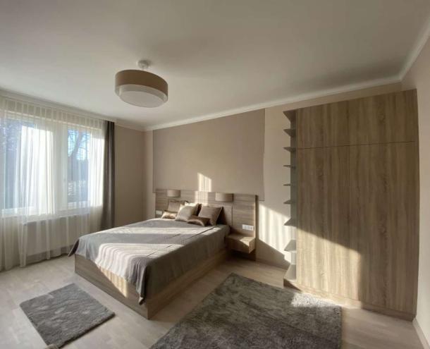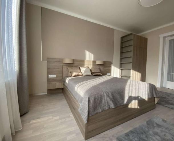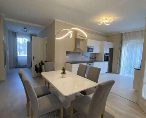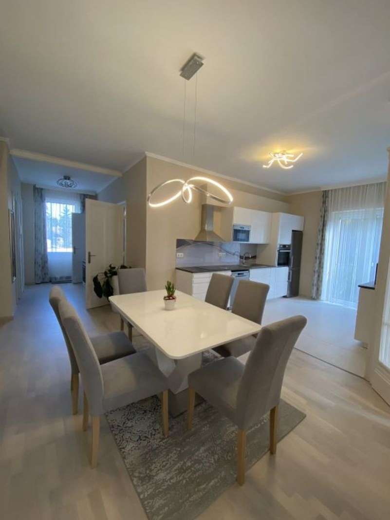 Helyiségei: nappali erkéllyel, 1,5 hálószoba, nyitott konyha a hallban erkéllyel, gardróbszoba, 1 fürdőszoba (kád, WC), külön WC. A lakás belső építész által megtervezetten, bútorozva kiadó. A lakáshoz 1 autónak garázs tartozik. A kertben közös használatú szaletli.