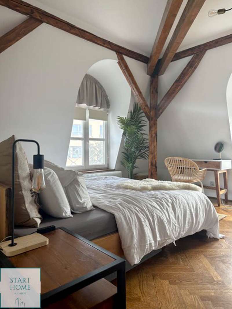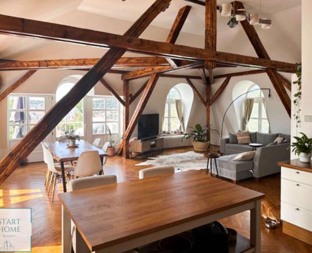 PANORÁMÁS VILLALAKÁS! Nagyon szép villa tetőterében kiadó egy 112 nm-es lakás. Helyiségei: amerikai konyhás nappali étkezővel, 6 nm panorámás terasz, 2 hálószoba, 1 nagy fürdőszoba. A riasztóval és mobil klímával felszerelt lakás részben vagy egészen bútorozva bérelhető, a közös ktg.: 40.000 HUF/hó. A kertben 1 parkolóhely tartozik a lakáshoz. Elérhető 2026. márciustól.